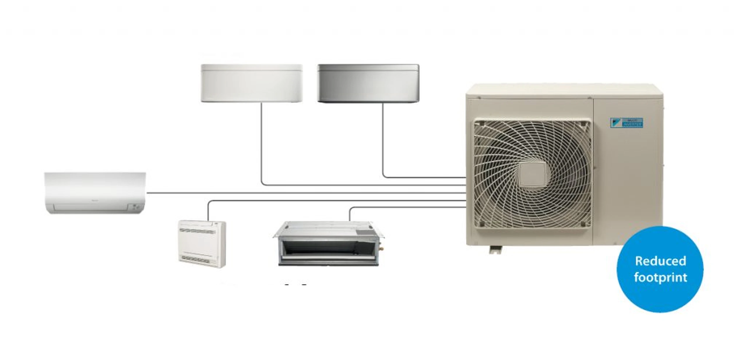 Flexibilní MULTI VARIABLE nabízí jednoduché řešení pro připojení 1 až 5 vnitřních jednotek na 1 jednotku venkovní. Široká nabídka vnitřních split jednotek se přizpůsobí různým typům interiéru nebo použití. Nástěnné / kazetové / podstropně-parapetní / kanálové a konzolové vnitřní jednotky jsou určeny pro chlazení a topení v různých výkonech